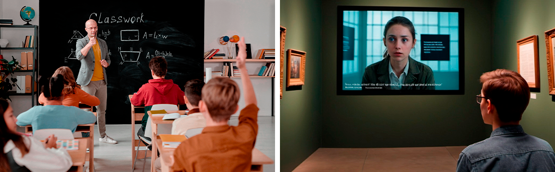 A sinistra foto illustrativa di una lezione scolastica in cui il professore utilizza una lavagna per fare dei disegni grafici.