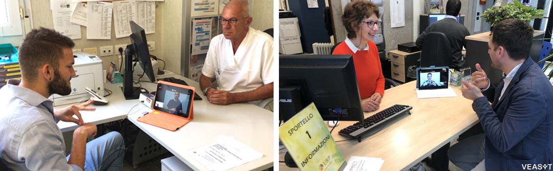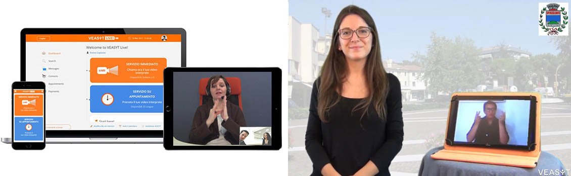 VEASYT Live! è il servizio di video-interpretariato in lingua dei segni disponibile tutti i giorni dalle ore 8.00 alle ore 18.00 che permette ai collaboratori del Comune di interagire più facilmente con i cittadini sordi che si recano in Municipio per informazioni, documenti, richieste o altro.